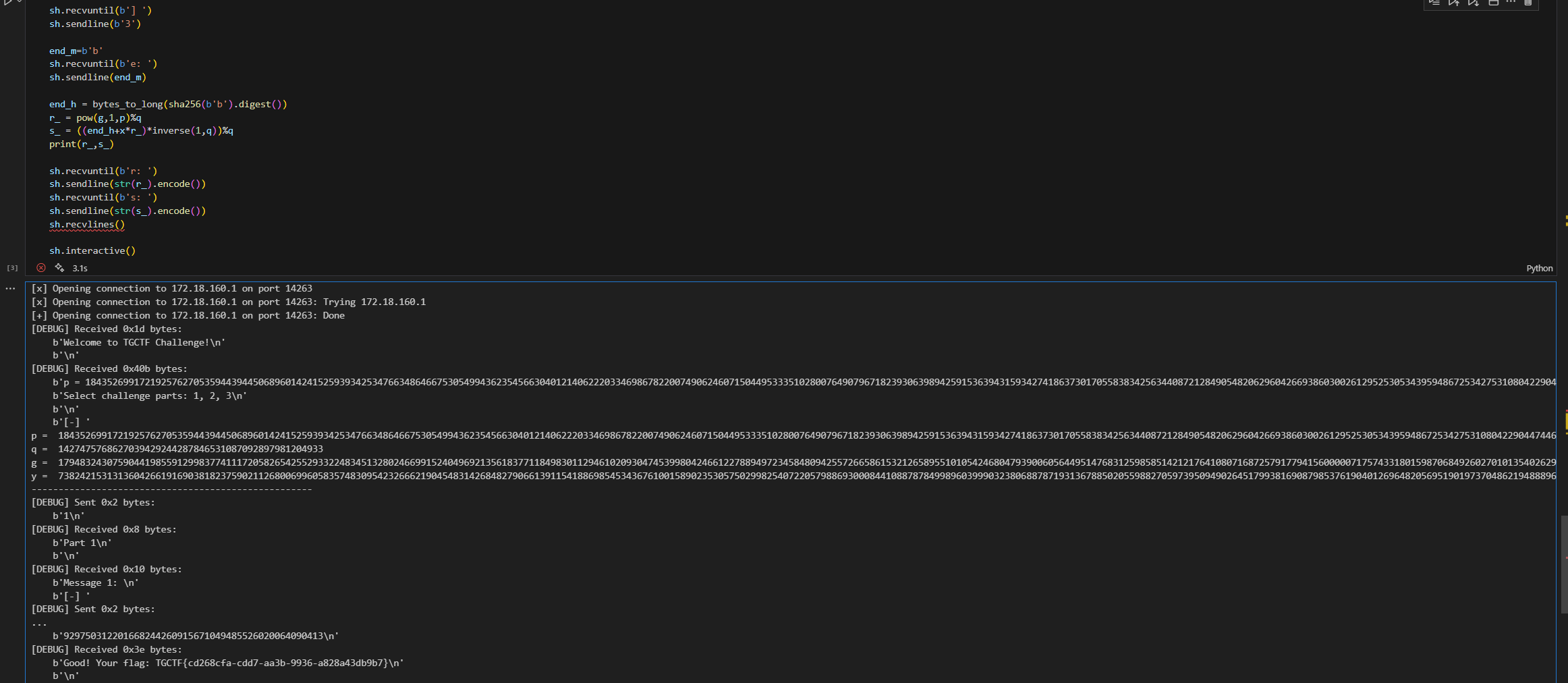 sh.recvuntil(b'p = ') p=int(sh.recvuntil(b',').decode()[:-1]) print('p = ',p) sh.recvuntil(b'q = ') q=int(sh.recvuntil(b',').decode()[:-1]) print('q = ',q) sh.recvuntil(b'g = ') g=int(sh.recvuntil(b',').decode()[:-1]) print('g = ',g) sh.recvuntil(b'y = ') y=int(sh.recvuntil(b'\n').decode()[:-1]) print('y = ',y)