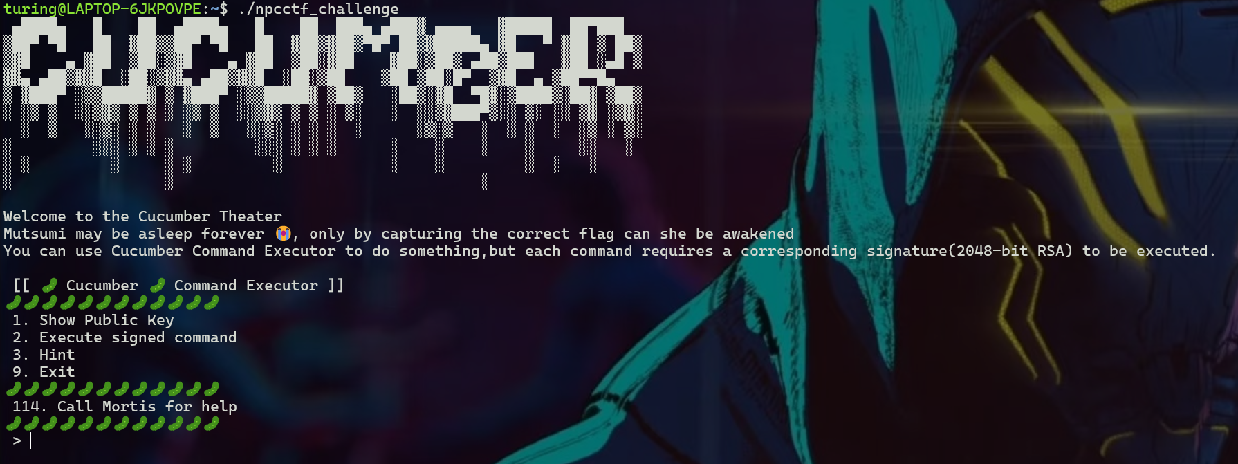 phi = (P-1)*(Q-1) d = inverse(65537, phi) m = pow(C, d, N) print(long_to_bytes(m)) # b'Next,L^3&?CRYPTO. BanG+DrF_4m!-AvE:Mujic@'