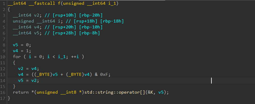 state = 1 out = [] for i inrange(32): fn = fib(state)[0] out.append(charset[fn]) if i in (7, 12, 17, 22): out.append("-") state = (state*8 + 64 + i)&mask64 # c中64位int溢出处理 print("flag{" + "".join(out) + "}") # flag{10632674-1d219-09f29-14769-f60219a24}